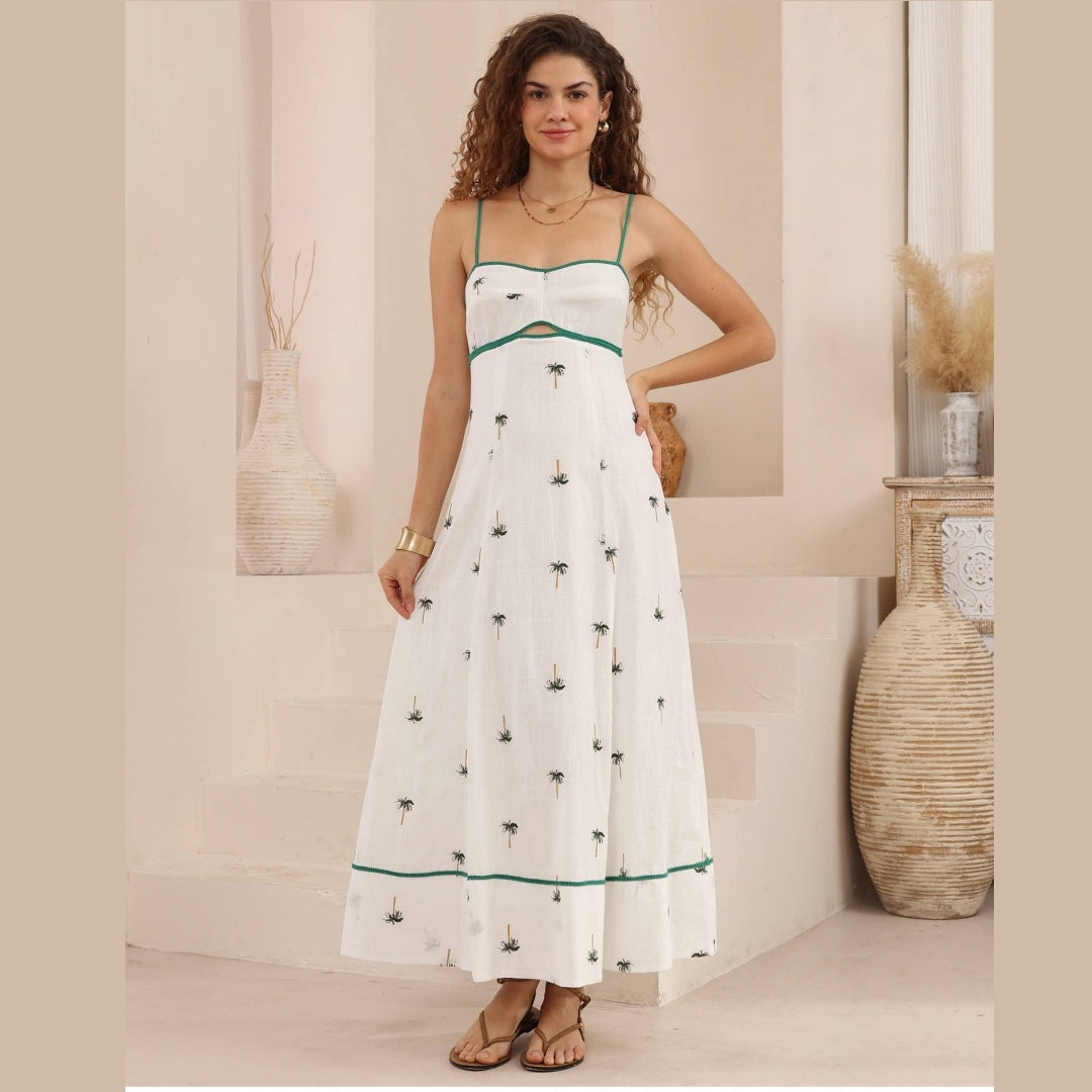 Palms Embroidered Green Tropical Maxi Dress